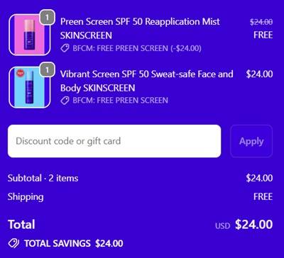 Stay safe in the sun with a BOGO and FREE SHIPPING! Add 1 facial sunscreen to cart and you’ll score the Preen Screen SPF 50 Reapplication Mist FREE! PLUS save 20% OFF sitewide during the Ultra Violette Black Friday Sale Event! From mist to hydrating lotion, enjoy waterproof and skincare-infused formulas and score a FULL SIZE freebie WHILE SUPPLIES LAST!