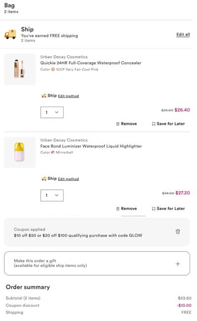 Stackin savings? Yes, please! Take 20% OFF your Urban Decay must haves PLUS use the code below to save an ADDITIONAL $10 OFF purchases $50+ or $20 OFF your order of $100+ at Ulta Beauty! Whether you’re restocking the tried and true All Nighter Setting Spray or the newest 24/7 Glaze-On Liquid Eyeshadow, add to cart and enjoy the stacking savings while you can! Take a look at our example cart below!