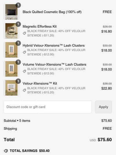 No code needed, eligible items are priced as marked. You will be prompted to choose your FREE Velour Beauty Black Friday gift with purchase once your order qualifies. FREE SHIPPING applies to all orders $35+. Exclusions may apply. Take a look at our other favorite finds!