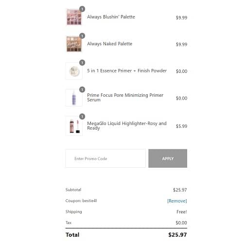Use the wet n wild discount code BESTIE4L to add the offer to your cart. Limit of 2 FREE items per order. FREE SHIPPING applies to orders $25+. Exclusions may apply.